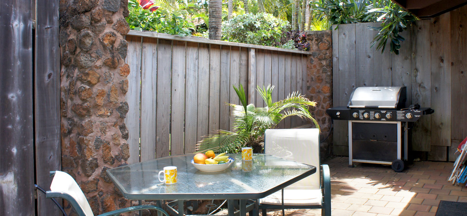 The Cottage at Kauai Cove has a very Hawaiian feeling...with a Queen Bamboo Canopy Bed, high vaulted ceilings, nice bathroom, lots of woodwork and private patio area with gas BBQ grill.